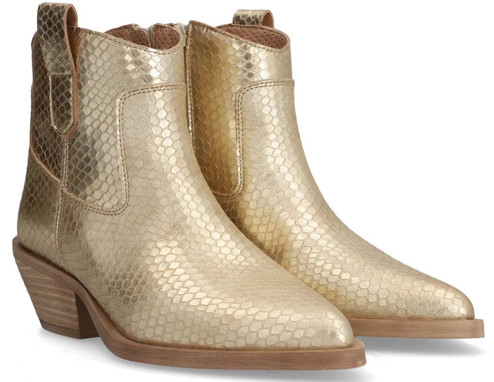 Bottine femme ALPE « Holly » en cuir couleur platine avec talon de 4 cm, semelle antidérapante et bout pointu, avec fermeture zippée et tige basse.