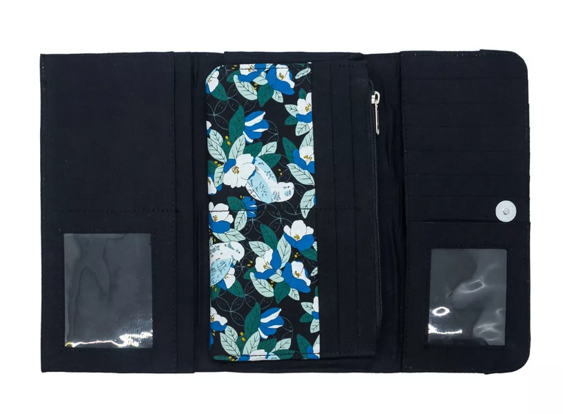 Avec son extérieur en tissu imprimé et son intérieur en coton uni, il offre une touche d’originalité tout en restant élégant. Sa structure rigide garantit une tenue parfaite et une bonne résistance à l’usage. Grâce à son format généreux, doté de 13 compartiments pour cartes (dont 1 plus grand pour le permis ou la carte d’identité), 2 compartiments photo, d’une triple poche à soufflet pourvue d’une partie zippée pour les pièces, de 2 grandes poches plaquée pour y glisser un chéquier, billets .. tout en restant compact pour être glissé dans un sac à main. Son fermoir magnétique permet une ouverture et une fermeture faciles tout en sécurisant son contenu.