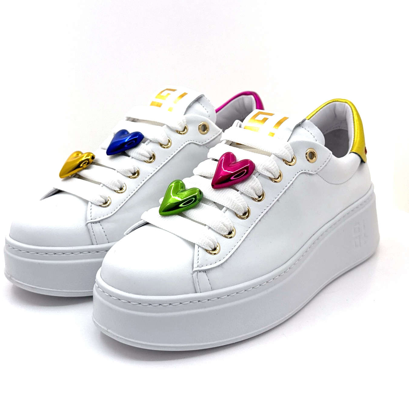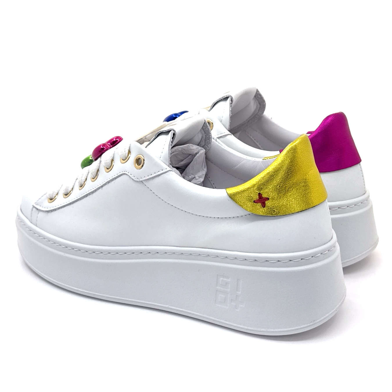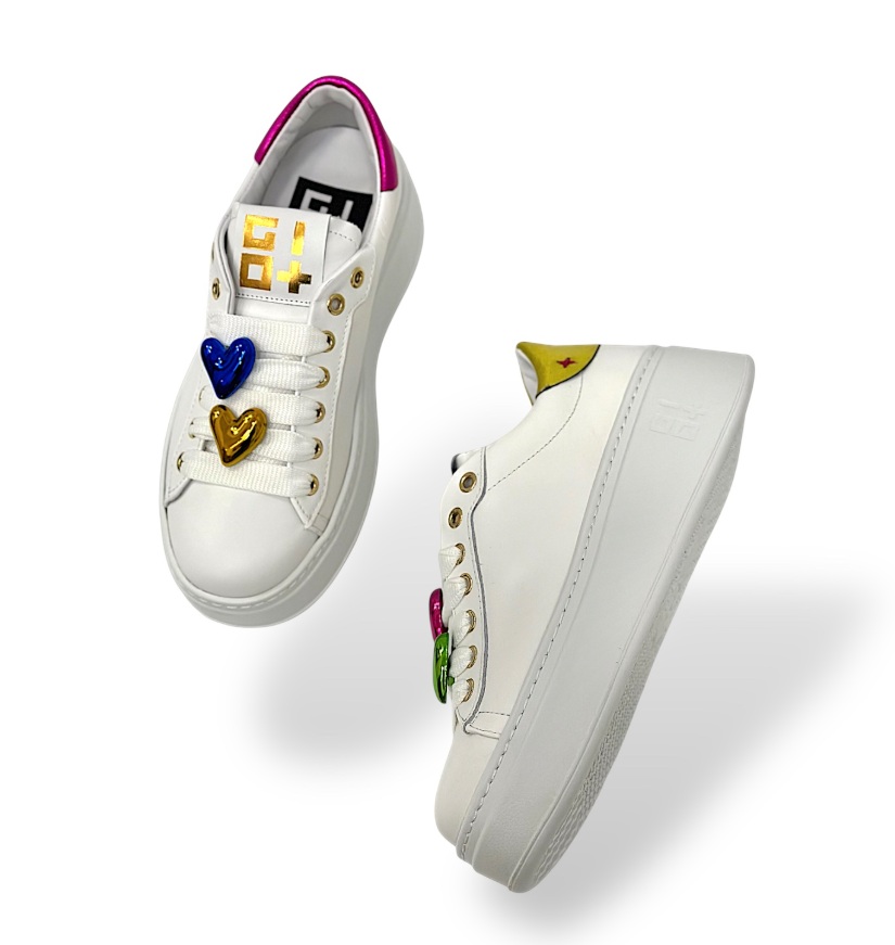 Exprimez votre individualité avec les baskets bijoux exclusives Gio+ « Pia328a », véritable joyau du savoir-faire italien qui célèbre l’originalité. Leur tige en cuir de veau blanc raffiné est rehaussée de joyeux accessoires multicolores en forme de cœur. Leur fermeture à lacets plats en coton s’harmonise parfaitement avec les raffinés œillets en métal doré. Le logo plaqué or attire le regard sur l’étiquette de la languette, tandis que l’intérieur en cuir avec semelle intérieure amovible et cheville rembourrée assure un confort optimal tout au long de la journée.