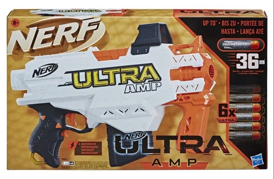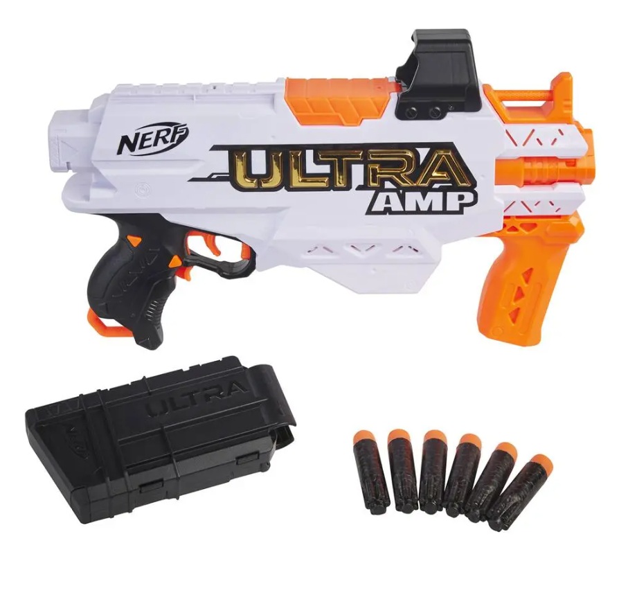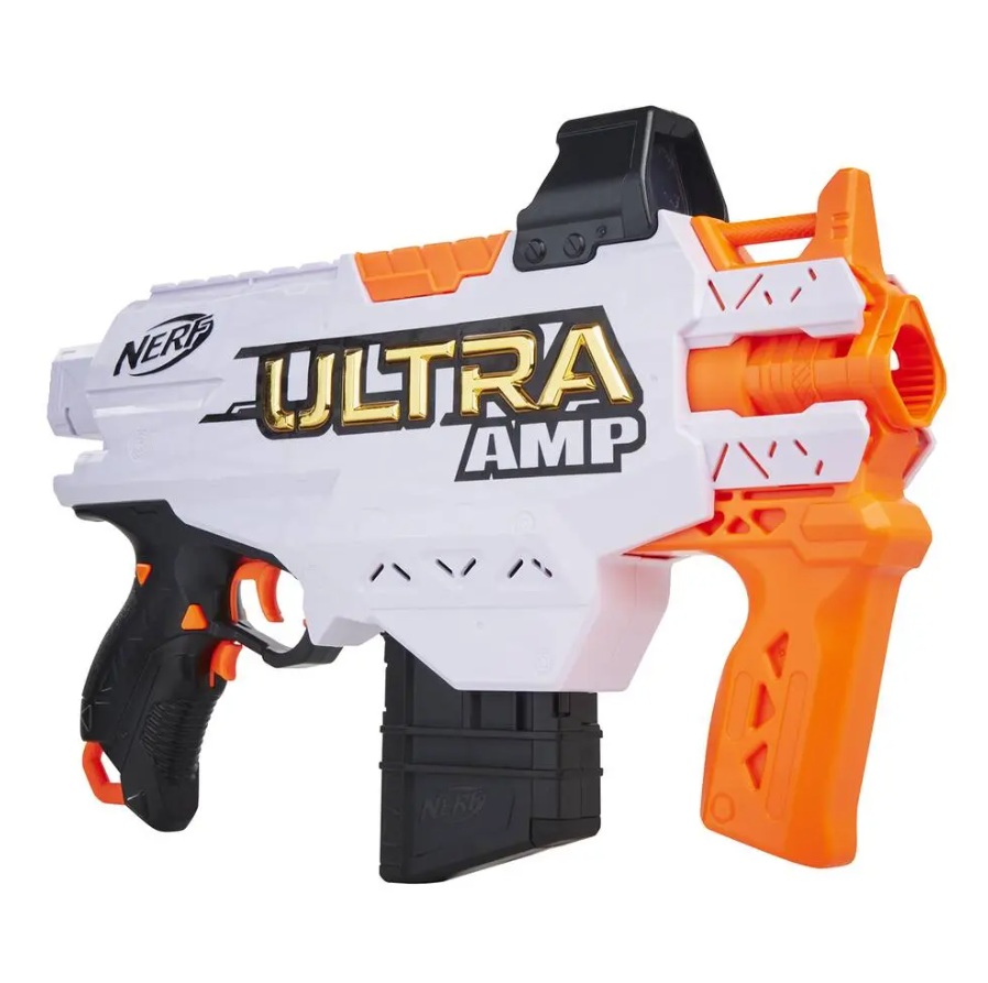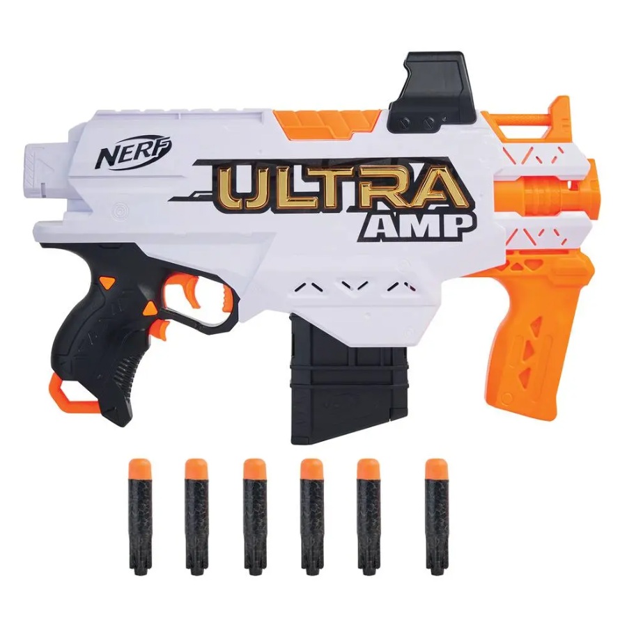 Pour une expérience NERF ultime offrant rapidité, précision et tirs à distance, les NERF Ultra sont les blasters premium alliant parfaitement performance et design. Inclus avec 6 fléchettes NERF Ultra technologie Aerofin testées et approuvées pour leur qualité et leur performance, le blaster motorisé NERF Ultra AMP dispose d’un chargeur 6 fléchettes clipsable grâce au nouveau système Ultra. Pour aller plus loin dans la personnalisation, il dispose d’un point de fixation pour crosse ainsi qu’une lunette intégrée pour améliorer sa précision.