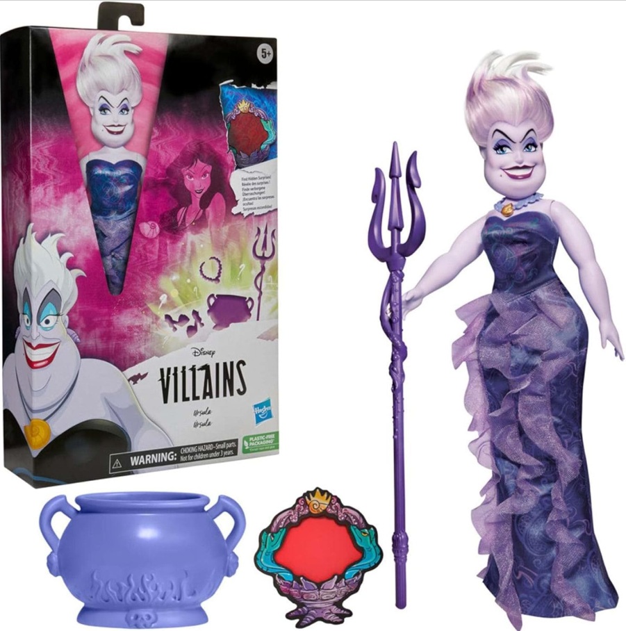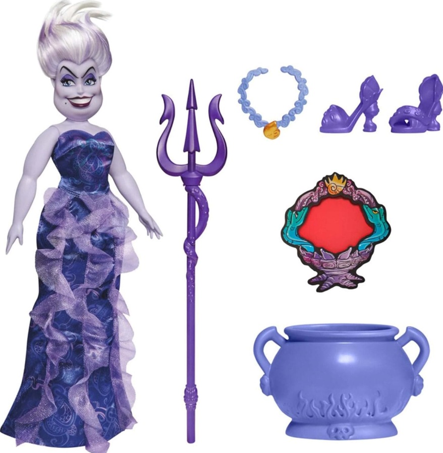 Cette poupée mannequin d' »Ursula » de 28 cm au style sinistre a une robe incroyable avec des volants inspirés des vagues de l’océan, des chaussures et un collier. Cette poupée de la sorcière des mers de La petite sirène de Disney est vendue dans une boîte avec compartiments secrets contenant des surprises pour une expérience de déballage super amusante. Les enfants (à partir de 5 ans) peuvent trouver les compartiments en utilisant le décodeur inclus, puis les ouvrir pour découvrir les accessoires amusants qui s’y cachent. Le décodeur permet aussi de révéler des motifs cachés sur la robe de la poupée Ursula.